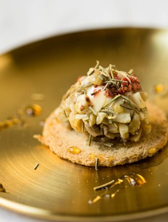 Aperitivo fácil y elegante:queso cremoso envuelto en frutos secos con miel y pimienta rosa y romero