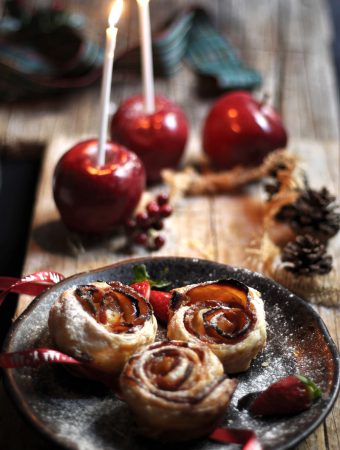 Flores de manzana y hojaldre con explicacion paso a paso y una cuidada presentación con fresas y elementos decorativos